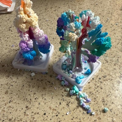 This was a fun experiment to do with my kiddos ages 4, 9, and 11. My 11 year old guided the other two. They enjoyed the coloring and setup, we didn’t have a dropper so initially poked a couple holes in the liquid bottle to sprinkle over the trees. Within 30 mins just as the guide said we started to see “crystals”. Its very pretty with the colored parts of the tree and the liquid blending to create colorful “crystals”. My 9 year old had dibs on the geode. The only downside is that it won’t last long and fragile fluff. But, still great for a rainy day experience.