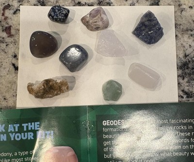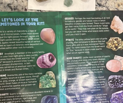 Really enjoyed this kit it was interesting and fun the gems are so pretty but I don’t think I got pyrite cause it was not yellow or shiny gold and I only got nine but that doesn’t really matter cause it was amazing