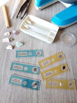This cute little microscope is so stinkin cute and fun! I love that it comes with plenty to get you started, right out of the box! But, it also comes with a few blank slides, making the possibilities endless, honestly! You have rocks that you can study and a few prefilled slides that you can study! It also comes with a little tube, tweezers and container that you can use to put something in from outside, inside, etc! And a little secret, it comes with a little plastic container to store your slides in! If you remove the rectangular piece that is on the base, you will be presented with the storage box! It is a little hard to get out the first time, but after that it seemed to be fairly easier! You will need batteries for this set, for the light. Also, the holder is adjustable and you have a few different zoom options! My daughter had such a blast studying some leaves from outside! She decided to see if she could study her fingerprint, too! It worked pretty well! I have a feeling she'll find a lot of things to use this for!