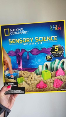 The National Geographic Sensory Science Activity Kit encourages experimentation and curiosity! This kit has five varieties of sands, slimes, and putties along with an experiment guide that has more than 10 science activities for kids that allow them to explore the properties of each substance. The putty, slime, and play sand in the kit are premade.