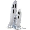 This Halloween decoration features three white ghost characters each at a different height but all with large black eyes and wide howling mouths. Each ghost is constructed of a soft fabric that is wrapped around sturdy wire frames that attach to a single base. A total of 70 cool white LED lights wrap around the back side edges for an eerie glow. This fun decoration can be displayed in indoor or outdoor locations.
