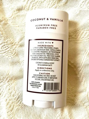 [This review was collected as part of a promotion.] I really loved this deodorant; it's the second time I've used it, and the best thing about it is its exquisite coconut fragrance. It has a smooth texture and doesn't leave any residue. I highly recommend it. The ingredients are ideal because it's aluminum-free.