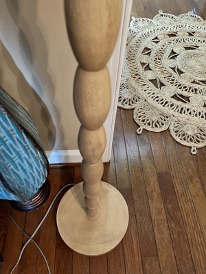 Bring soft lighting and modern style to your decor with this Natural Polyresin Floor Lamp from Room Essentials™. This natural floor lamp features a white curved shade that's attached to a spindle-shaped slim frame with a pedestal base for polished appeal. The turn knob rotary switch with three-way light setting helps you adjust the light according to your needs, and a six-foot power cord makes it suitable for a variety of spaces.