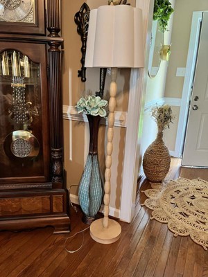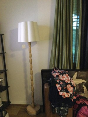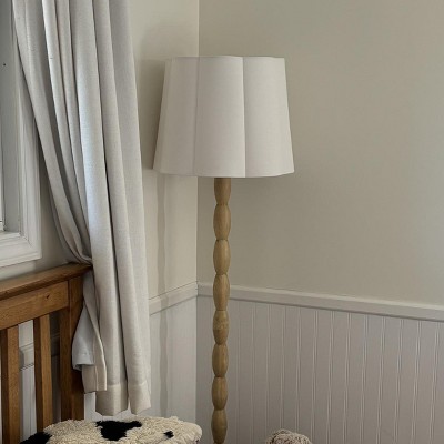 This Room Essentials floor lamp adds an earthy charm to any space. The lamp shade is white and has a scalloped design. The base of the lamp is extremely sturdy. You do not have to worry about it wobbling or tipping over. It will blend effortlessly into any corner or living area. If you're looking for a simple yet stylish lamp, I recommend the Room Essentials Natural Polyresin Floor Lamp.