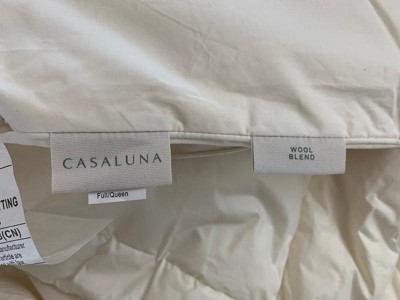 I have the Full/Queen Wool Blend Comforter - Casaluna™ and it is so warm. It fits my bed perfectly and it washes up great. It seems very heavy but does not feel heavy at all! It did not shrink nor stretch when I washed it and it did not wrinkle up like some do. I am very happy with it.