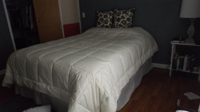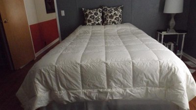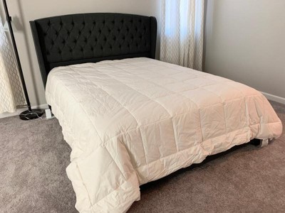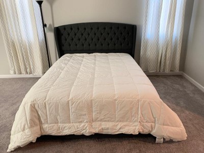 This comforter is just the perfect weight, not too heavy or too light! The off white color goes well with my wall color and other bedroom décor. This comforter lays out nicely on our bed, giving it a classic look. I've purchased other Casaluna bedding in the past and it has always been excellent quality, this comforter is no different! The outer side is made of 100 % cotton, making it feel really soft and comfortable. This is a very nice comforter that I would be proud to recommend!