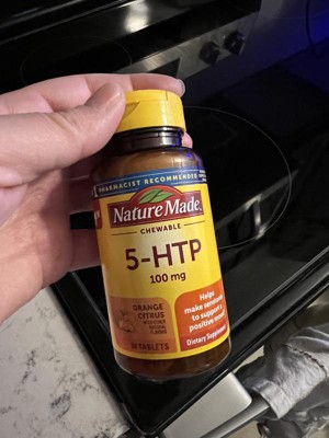Nature Made 5HTP 100mg chewable tablets help support a positive mood (1). 5-HTP is an amino acid that helps make serotonin, which supports mood health and well-being. This gluten free 5HTP supplement has no artificial flavors, no synthetic dyes-color derived from natural source, no dairy, and is suitable for vegetarians. Adults chew one 5HTP tablet per day as needed. Start your day with Nature Made 5HTP supplements. (1) 5-HTP is an amino acid naturally produced by the body used to help make serotonin, a neurotransmitter that supports mood health and well-being. *Based on a 2022 survey of pharmacists who recommend branded vitamins and supplements. These statements have not been evaluated by the Food and Drug Administration. This product is not intended to diagnose, treat, cure, or prevent any disease.CAUTION: People with bipolar (manic) depression or who are experiencing severe issues with mood, including thoughts of suicide, should not take any product containing 5-HTP except under a physician's supervision. If you are pregnant, nursing, or taking any medications including antidepressants, consult your physician before use.These statements have not been evaluated by the Food and Drug Administration. This product is not intended to diagnose, treat, cure, or prevent any disease.