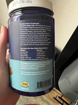 [This review was collected as part of a promotion.] We e been giving these to our 7 year old lab, Boomer, and he has been moving around so much better since he’s been getting them. He also thinks they are a treat so he gets super excited for them and we have no issue getting him to take them which is even better!