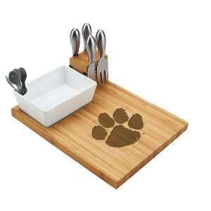 NCAA Clemson Tigers bamboo cheese board set, includes: Stainless steel serving tools, Cheese Knives (2), Cheese spreaders (1), Cheese fork (1), cocktail sticks (4) and removable ceramic dish with unique holder for the cocktail/olive sticks (1). Magnetic strip on board securely holds tools when not in use. The bowl fits into a recess milled into the board for stability. Designed by Picnic at Ascot in the USA.