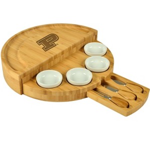 NCAA Purdue Boilermakers Premium Bamboo Swivel Charcuterie Board with 4 Intergrated Ceramic Bowls and 3 piece Cheese Knife Set in a pull out drawer. It folds down to half its size so its easy to stow in your cupboard. Measures 15" W x 8.5"D x 3" H (Closed), 15" Diameter x 3" H (open). U.S. Patent Nos. D925,997 S by Picnic at Ascot