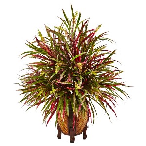 This Autumn Grass Arrangement is bursting with textured and colorful grassy leaves. The arrangement comes with a textured woven vase with sturdy, dark brown legs. This explosion of colors brings an autumnal touch to a living room, sun room or even bedroom.