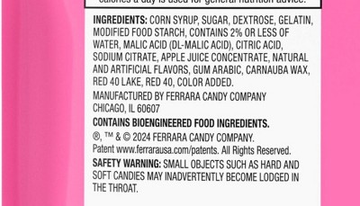 corn syrup, sugar, dextrose, gelatin, modified food starch, contains 2% or less of water, malic acid (dl-malic acid), citric acid, sodium citrate, apple juice concentrate, natural and artificial flavors, gum arabic, carnauba wax, red 40 lake, red 40, color added.