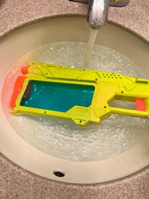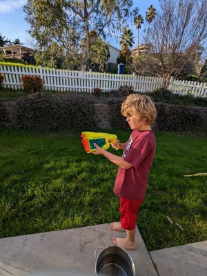 [This review was collected as part of a promotion.] This is a fun water gun! My youngest son has been asking for one for a while so he was super excited to play with this when it came in. The way you fill it with water is very unique and I like that it didn't leak like I thought it was going to. The water tank is large without the water gun being heavy, and the trigger is very easy for all ages to use to make the water gun work. My son also really likes the green gun with the blue tank since those are his favorite coolers.