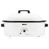 Serve up and celebrate with the White NESCO 18 Qt. Roaster! This versatile appliance is the classic that you’ve come to love for nearly 90 years, redesigned with you in mind. Roast, bake, cook, steam, slow cook, and serves, all in a single device. The 1,450 watt roaster base features Circle of Heat heating technology and a domed lid which allows for better air circulation and provides moist and even cooking. The removable, 18-qt. cookwell can roast a whole turkey up to 22 lbs., convenient for entertaining and large meals. Whether you're baking a ham, serving chili, or slow-roasting brisket, the full-range temperature control (200°F to 450°F) provides the versatility needed for a wide variety of cooking options. The durable porcelain enamel finish is easy to clean and ensures years of enjoyment. It includes a cooking rack with lift-out handles for baking and fat-free roasting. Set it to satisfy and bring that delicious flavor anywhere. The portable and convenient roaster is ideal for those special occasions and on-the-go family activities._