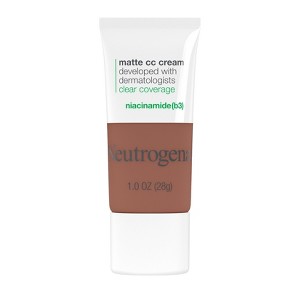 - Tube of Neutrogena Clear Coverage Flawless Matte CC Cream makeup in shade Warm Mocha 8.7
