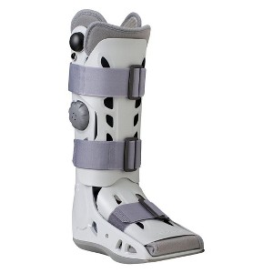 The large-sized Aircast AirSelect Elite Universal Fit Open Frame Walker Brace and Walking Boot in Gray is the most-advanced walking boot, engineered to provide the ultimate in protection, comfort, and edema (swelling) control. The Aircast AirSelect has a durable, semi-rigid shell that helps support the limb while providing full-shell protection. It offers a solution to a number or indications including fracture of the foot, ankle, lower leg, severe ankle sprain, post-operative immobilization and reduction of swelling. Overlapping Duplex air cells line the shell providing intermittent pneumatic compression for 3-times faster edema reduction. The front panel is pre-inflated and combined with the overlapping air cells, which provides a total contact fit. SoftStrike technology absorbs and dissipates shock, while the lightweight and lab-tested rocker sole combine to encourage a natural gait and a continuation of everyday activities. The Aircast AirSelect features a sleek, open-frame design that provides ventilation. The non-marking, skid-resistant rubber tread allows for greater traction and longer wear. Universal fit allows the Aircast AirSelect to be worn on either the left or right foot..