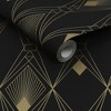 A full roll of this product is 8 inches wide and 11 inches long. A full roll can cover up to 0.6 square feet depending on the design match and pattern repeat. A sample of this product is 8 inches by 11 inches. Deco Geometric is an art deco geometric wallpaper design that oozes style and luxury. The deep black background topped with a full metallic gold print creates a statement design that is sure to transform any living space. This elegant design is printed on a fibrous paper that adds subtle texture and dimension. Offers a smooth, untextured finish. Straight match with 12.6 inch pattern repeat.
