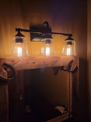 This fixture has a pleasant rustic look, just what I wanted in my Southwestern bathroom. It does not come with lamps (bulbs). I found some antique "Edison" incandescent lamps which completed the look. My only criticism is it is way overpriced for such a simple assembly.