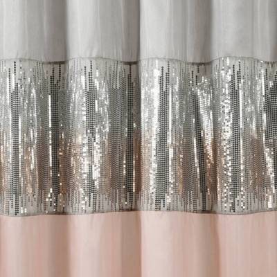 - Glam Shower Curtain: This single chic sparkly shower curtain measures 72 inches wide by 72 inches long. We recommend using a shower curtain liner to protect this fabric, liner sold separately.