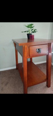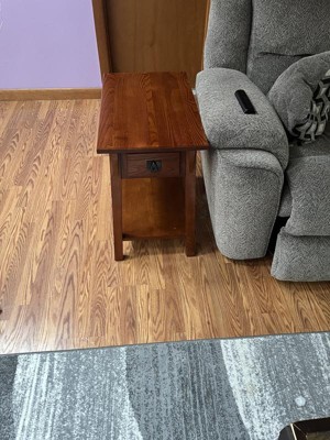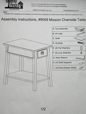 This Leick Home 9059-RS Mission One Drawer Side Table with Shelf in Russet has a smooth finish and very solid. The pieces were safely packed and I did not notice any scratches or flaws on the leg pieces or the table. The instructions are very easy. Before putting it together I just set out each screw with 2 washers and I used 2 per leg. It twisted in perfectly even and can use the little allen wrench that is included! Sometimes when I am assembling carts or grills or other furniture, the screw holes just are not drilled out evenly. But this was a very smooth process. Once the 4 legs are secure the bottom table piece just slides on while still having the table upside down and pop in the 4 small shelf supports! This table looks so nice and the drawer adds a decorative touch that I do find useful. It can match any decor and is built to last. Overall, I wouldn't change anything about it and highly recommend!