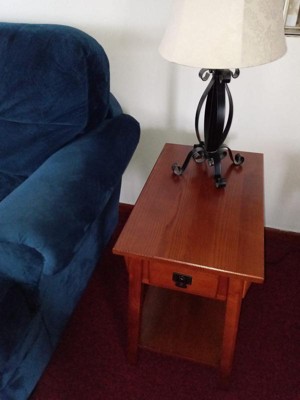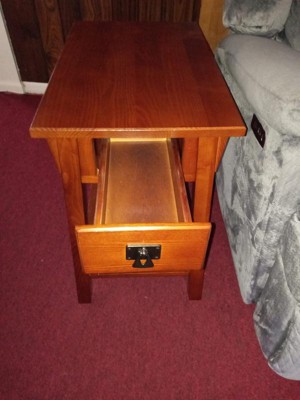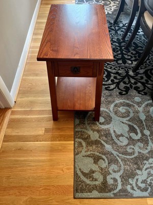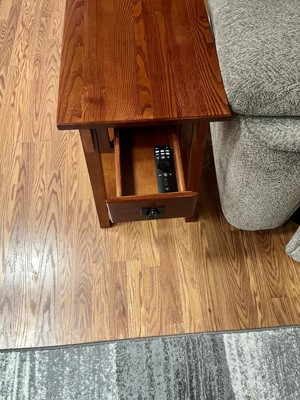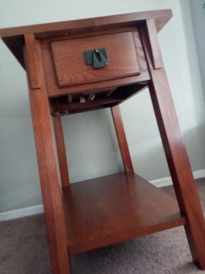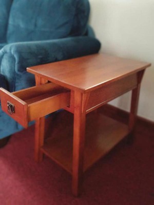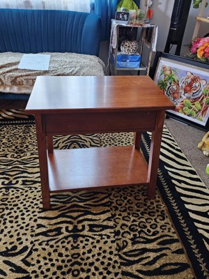 This side table is easy to put together. It took 5 minutes for me to have it completely done. This table looks high end, and the wood is solid. It has a durable wood drawer box and guide. Easy to follow directions. The bottom has a display shelf. I love that it has a rich Russet finish with blackened metal ware pull. It has a narrow shape is ideal next to recliners