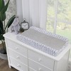 This NoJo Baby-Saurus Change Pad Cover features a white ground and a gray word and dinosaur foot print with a gray solid center panel. Measures 16" x 32" and is machine washable for easy care! Made with super soft fabrics to keep baby cozy. Fits a standard size contoured changing pad. Keep your baby comfortable and dry with this adorable changing pad cover!