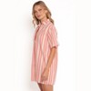 With short sleeves and a functional button-down front, this dress is as practical as it is stylish. What sets this dress apart is its exquisite embroidered pink stripe feature.