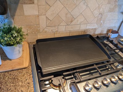 If you have been looking for a two burner griddle, look no further. You have found the one! It is durable, non stick coated, long and has a great weight to it. It is slightly sloped on one side so it drains to the front as you cook! The tall back sides help to reduce splatter, which reduces clean up. Yes, please! The tall sides also help me to slide my spatula under my food so I can get it on the spatula easier to flip. Can you tell I love this griddle? I highly recommend it!