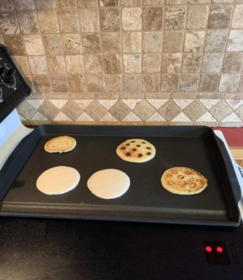 This griddle is precisely what we needed. Our kitchen doesn’t have an abundance of extra counter space for an electric griddle, and we often felt the frustration of attempting to prepare lots of food in the limited space of a frying pan. This griddle takes a few minutes to heat up, but the heat distribution is impressively even, and the clean up is easy (the grease catch assists with that). Our favorite way to use this is for Saturday morning pancakes—we can significantly expedite the cooking process because this griddle allows us to cook up to eight pancakes at a time!