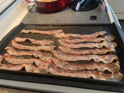 This is perfect for Sunday breakfast! I have a five burner stove so I couldn’t put it straight in the back row so I used my two left burners and it fit perfectly! Also truly nonstick. I’ve made my whole breakfast on there without a problem and not much splattering from my bacon or sausage. My pancakes came out nice and fluffy!