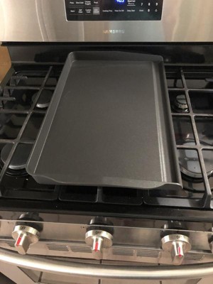 This is my favorite stovetop griddle. I have a gas stove and this fits perfectly over the center burner of my stove. There are a couple of great features besides the nonstick finish. The large well which catches the excess fat is a big plus when cooking breakfast meats. My favorite feature is the low side which enables you to get a spatula under your pancakes, eggs etc. My other griddles don’t have this feature and it’s always a challenge. This is a scratch able surface so it’s best to use a silicon spatula or tongs. It’s heavy duty and made to last.