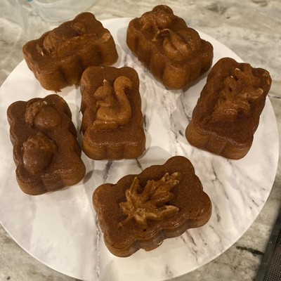 This beautiful copper Nordic ware mini loaf pan made six harvest loaves in a variety of cute fall patterns! The pan is very well made and my pumpkin loaves did not stick to the pan when I turned it over and left each mini loaf design perfectly intact! The mold patterns are so cute especially the squirrel! I put each loaf in cellophane bags and tied with fall color ribbons and tags and gifted to all my friends and family for thanksgiving! They all loved it! This pan baked each loaf evenly and more importantly it saved me so much baking time as I was able to do 6 mini loafs at once! I will be on the look out for Nordic wares Christmas pans as well!