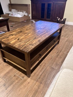 I was hesitant to order furniture on-line and am happy to report the coffee table worked out great. I had to hire a handyman to assemble. The natural aged brown color is just like the product photo. The drawers pull in and out just fine. Overall, I'm happy with this product and can recommend it to others. The price was very reasonable as well.
