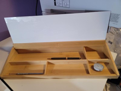 This is a neat little desk holder. The tablet holder is very sturdy with a case on. The one I received didn’t come with pens or eraser, you will need to purchase those. The organization on the inside has space for paper, pens, or any small item. If you like a clean desk, this little item may help. When it arrived, it did have a small chip, which was easily to pull off. (See picture) Be sure to peel off the film on the whiteboard before trying to write on it.