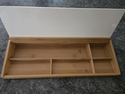 This wooden desk organizer tray stylish and functional. It has a whiteboard that lifts up and can be used on either side. There’s no lip on it so it’s not easy to open initially, but once you know where to open from, it’s easy. The inside has several compartments to keep your desk tidy and organized and keep things you don’t need out of sight. There’s a slot on the top to hold a tablet or notebook as well as a dry erase marker. It’s sturdy and well constructed and works well on your desk, or can even be used to organize your keys or other small items.