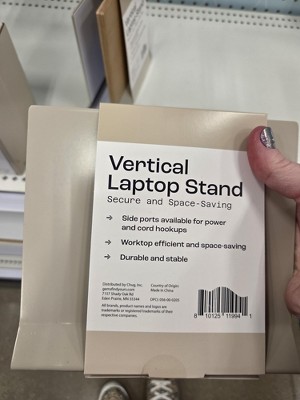 This is a nice vertical laptop stand. It is nice and sturdy but doesn't take up a lot of space. It is nice to have when you need more room on your desk. It is easy to use and it is good for smaller spaces.