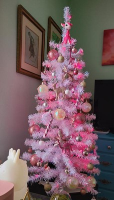 This 4ft pine tree features a mixture of white pine and shimmering iridescent tinsel needles The perfect tree to create the perfect winter wonderland effect. Small enough for offices and dorm rooms. Product Features: Pre-lit with 70 purple lights Lights have a pinkish hue Bulb size: mini 110 tips 2.25" wide tips 36” white lead cord Additional Product Features: Bendable wire branches Light sets on tree are UL listed for indoor or outdoor use, however the tree itself is recommended for indoor use If one bulb burns out, the rest will stay lit Lights are equipped with Lamp Lock feature, which makes them replaceable, interchangeable and keeps them from falling out Comes with replacement bulbs and spare fuses Comes with FREE plastic white tree stand 120 volts, 60 hertz, .24amps, 28.8 watts Dimensions: 4' high (from the base of stand to the top of the tree 22" base diameter (at the widest point) Material(s): PVC/plastic/metal/bulbs/wireNote: Branches are compressed for shipment, and need to be fluffed out upon arrival to look like the photo.
