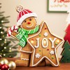 Bring sweet and festive cheer to your holiday decor with this battery operated 13.5-inch gingerbread boy with a lighted "Joy" star. This adorable figurine features a smiling gingerbread boy wearing a candy cane striped hat and green scarf, holding a large star-shaped cookie. The star is beautifully inscribed with the word "JOY" and is illuminated with 3 clear LED lights, adding a warm and inviting glow to your mantel, tabletop or covered porch.