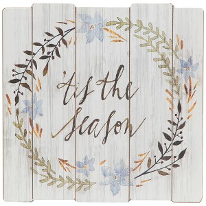 Hang a wood holiday sign that complements your home’s aesthetic. Our 12-inch wall sign for holiday features a floral design in watercolor style on a whitewashed wood-plank look backing. The design of muted green foliage and soft blue flowers encircles the words “Tis the Season.” A perfect blend of holiday sentiment and country farmhouse or rustic decor.