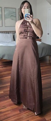 Crafted with a soft satin feel that flows beautifully, this dress is all about polished ease. The halter neckline with a tie close and the front cut-out design adds just the right amount of edge, while the decorative bow detail keeps it chic and refined.