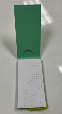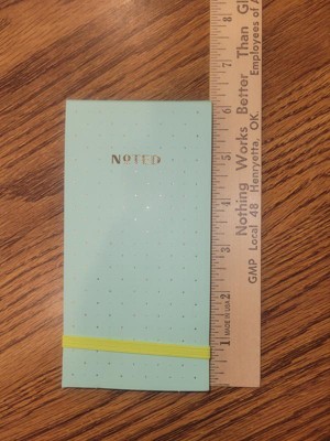 [This review was collected as part of a promotion.] This pad is as cute as can be. It consists of a durable cover held in place with an elastic band, and 100 pages. I find it useful to carry in my purse, to use whenever a sticky note or list is called for. I love how the pages have dots instead of lines, and the adhesive sticks well, without leaving a residue behind. It fits well in my hand and is easy to hold while I make notes. The size is 3"x6". I enjoy being able to carry it in my purse or pocket without pages becoming bent or wrinkled. I've used the pad for shopping lists as well as notes added to recipes and bills. I would not hesitate to purchase this product to give as gifts or to use myself.