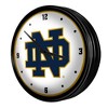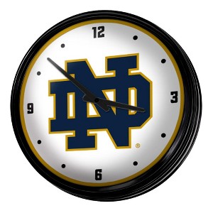 This premium University of Notre Dame Retro Lighted Wall Clock will be sure to add the finishing touch to any room of the home or office. This piece is injection molded and features a high-resolution, high gloss digitally printed face. Comes with an 8-foot power cord and an on/off pull switch for the light. LED illuminated. Hanging hardware and light bulb included. This is an officially licensed product of the Fighting Irish and made in the USA.