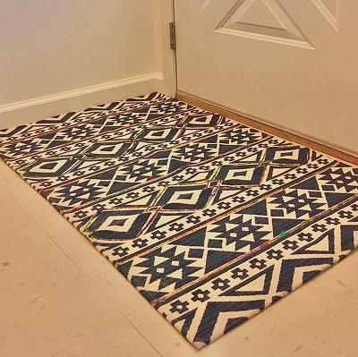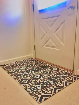 Just bought this cute little rug. It looks great in front of our back door! The bottom side is a grippy material, which is really nice.
