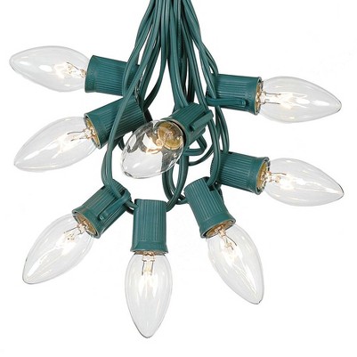 Novelty Lights C9 string light set with 125 bulbs is perfect for outdoor patios, decks, special event or Christmas lighting. Each set includes 125 long life C9 bulbs (25 extra included) on a green wire stringer with 100 sockets that are spaced 12" apart. These durable vintage filament clear transparent c9 light strings have long lasting 3,000 hour bulbs and are on a 20 gauge SPT-1 green wire. All our c9 light strings use high quality materials that will stand up to all weathering. These C9 string light sets are great for putting on a roofline, decorating and indoor/outdoor tree, restaurant lighting, wedding events, and much more.