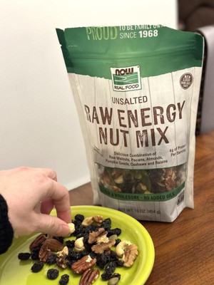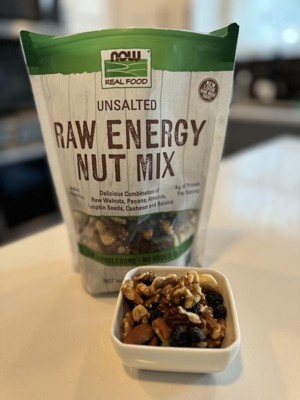 Looking for a natural boost of energy to get you through the day? NOW Real Food Raw Energy Nut Mix is a tasty and nutritious combination of raisins, walnuts, pecans, almonds, pumpkin seeds and cashews that's a perfect energy boost.Our Raw Energy Nut Mix is an excellent source of iron. Not only do you get a natural boost of energy to keep you going strong, you also provide your body with essential nutrients for good health. Talk about a win-win!Ingredients