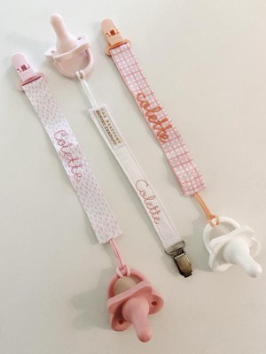 So pleased with the quality and appearance of these precious paci clips! The clip is strong and easy to use/maneuver. Bonus- they are a great material for monogramming!