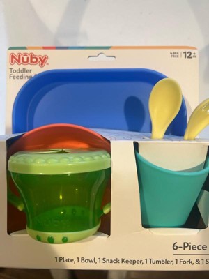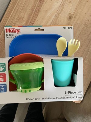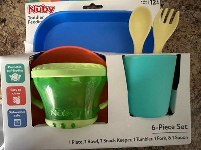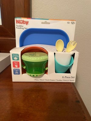 [This review was collected as part of a promotion.] I truly am impressed with the overall quality, design, and durability of this Nuby toddler feeding set. This set is incredibly durable as my son has dropped each item several times and it has no signs of wear or tear. It is definitely built to last! I love that it's both dishwasher and microwave safe, making cleanup and heating meals so much easier. My son is learning to feed himself and this set has made a huge difference in his fine motor skills and independence. The size and design are perfect for his little hands and he’s able to grip the utensils without any problem. The snack keeper is a fantastic bonus, it's easy for him to access, and he can stick his hand through the top to grab snacks without making a mess. It’s perfect for on-the-go snacks as it helps to keeps everything contained and easy to access. The cup has also played a huge role in helping him to transition off the bottle and sippy cup. He’s been using it with ease, and it’s been great to see him adapt to drinking from a regular cup. It’s been amazing to watch my son become more confident and independent at mealtime. I highly recommend this set for any parent looking to support their toddler’s development and to make mealtime and snack time a little smoother. You won’t be disappointed.