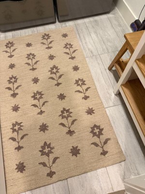 Bought this in the sand colorway, and it's just okay. The flowers lean purple, and I was expecting more of an neutral color. Also several dirt stains on my particular rug, which probably will come out with cleaning but who wants to do that on a brand new item?