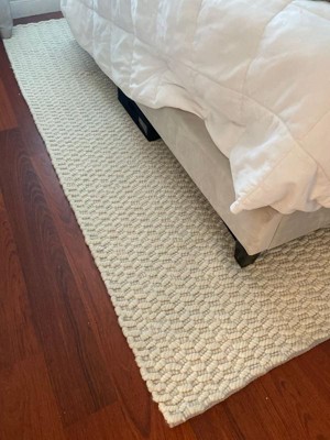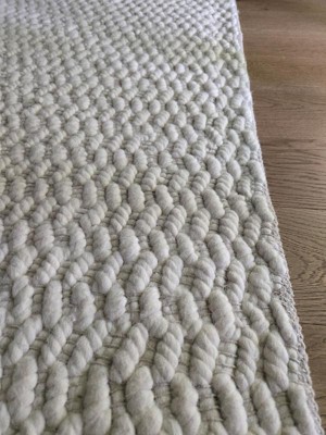 (This review was collected as part of a promotion.) Recently purchased the Sutton Solid Chevron Rug in Ivory and was pleasantly surprised by the speedy delivery, the quality and softness! It's 80% wool and 20% cotton and a perfect combination of firm and soft. It doesn't smell (like some new rugs do) and minimally sheds. I only wish I'd gotten a larger size. As it is hand made, the edges are not perfectly symmetrical which adds some funkyness to the shape.