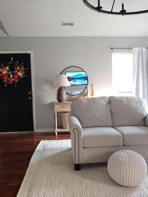 So this lamp is OK saw it on Instagram thought it was nice but it seems much more old Times in person. The shade is ugly kind of a speckled dirty looking khaki color Whoch blew my mind not like the pictures and the base is nice looking but extremely light weight if it accidentally got knocked over which would be easy to do it would break. So definitely not what I expected I will probably get a white or off white shade later on I would’ve returned it if it was an in store purchase but after getting out of box and putting together not with the hassle